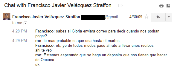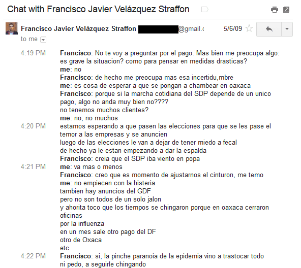 Para demostrar lo que afirmo, presento la siguiente serie de pantallazos de conversaciones vía gtalk con Francisco Javier Velázquez Straffon.